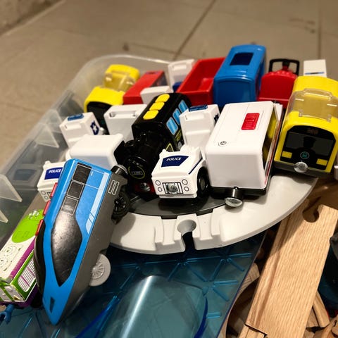 Pitkät pätkät junarataa, vaunuja, veturitalli, ym. Vielä kerkiää pukinkonttiin. Saat kuvan säilytyslaatikon mukaan. Vain nouto.