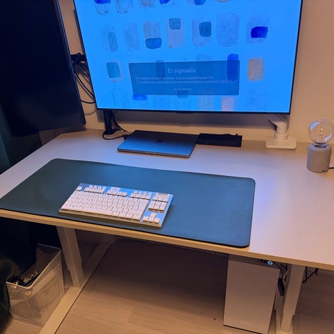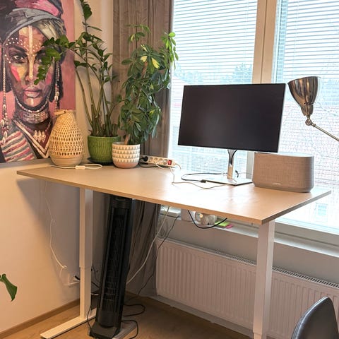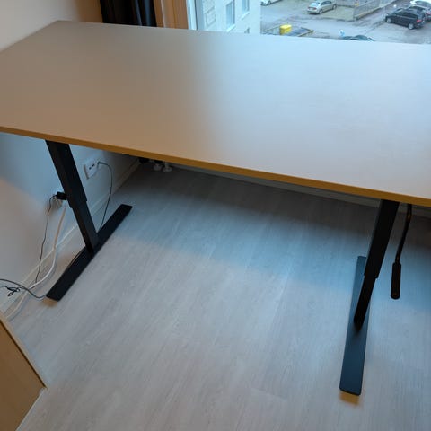 Myydään Ikean trotten työpöytä beigellä kannella ja valkoisilla jaloilla.