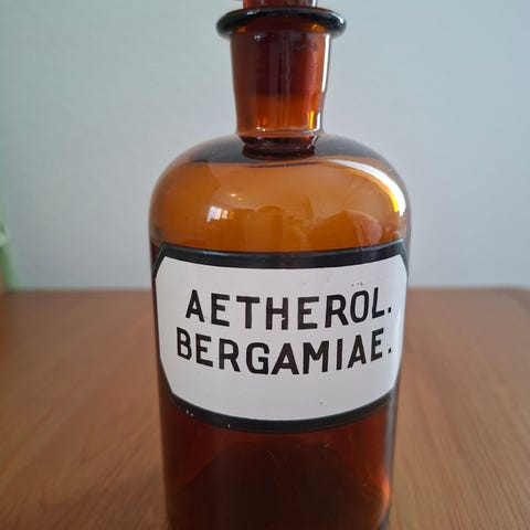 Ruskea lasinen apteekkipullo, jossa etiketti Tinct. Canthar. Pullon korkki on lasia ja se on suljettava. Sopii sisustusesineeksi. Korkeus 18,5cm.