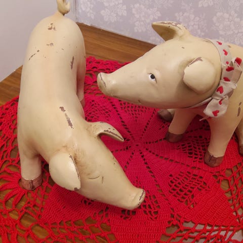 Savenväriset, korkeimmat 15 cm. Yhdellä miespuolisella liimattu pää uudelleen. Muuten täysin ehjät. Tädin jäämistöä, tarkkaa ikää ei tiedä.