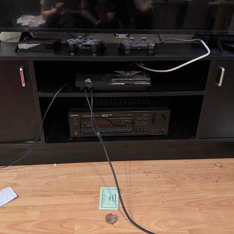 Valko-ruskea Tv-taso. Pöytälevyssä vähän kupria ja muitakin pieniä käytönjälkiä löytyy, mikä näkyy kuvassa, mutta ajaa vielä asiansa.