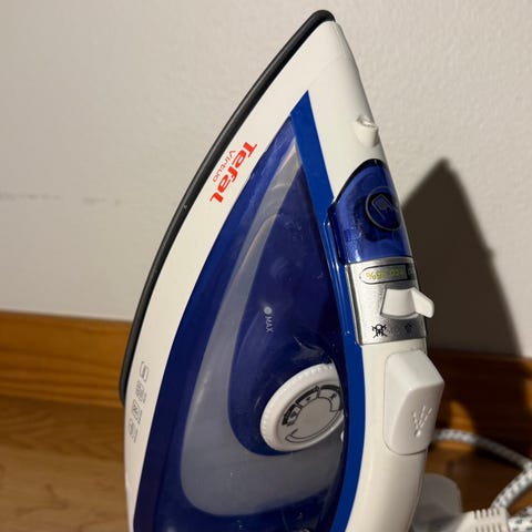 Tefal höyrysilitysrauta, sinivalkoinen väri. Varustettu höyrytoiminnolla ja säädettävällä lämpötilalla. Pohja on valmistettu helposti kankaalla liukuvasta naarmuuntomattomasta Durillium -materiaalista, jota käytetään Tefalin huippumalleissa.