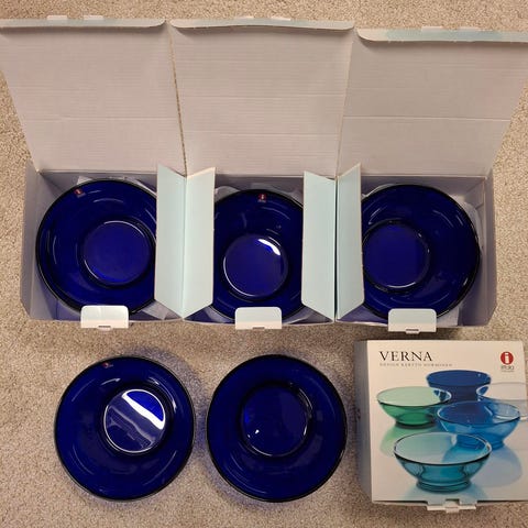 4 kpl uusia Iittalan Verna koboltin sinisiä annoskulhoja. Kerttu Nurmisen suunnittelemat Iittalalle. Tuotanto lopetettu V 2007. Kork.11cm halk.9cl.Vetoisuus 24cl.Kaikissa Iittala tarra. Hinta 35e+pk