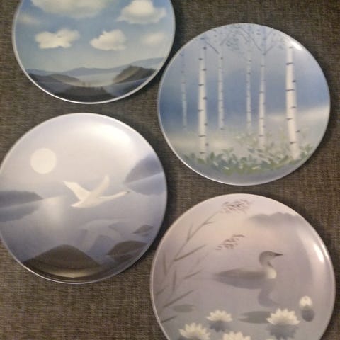 Apilanlehden seinälautaset. Yhdestä lautasesta lähtenyt pieni pala reunasta muut ovat uuden veroisessa kunnossa.