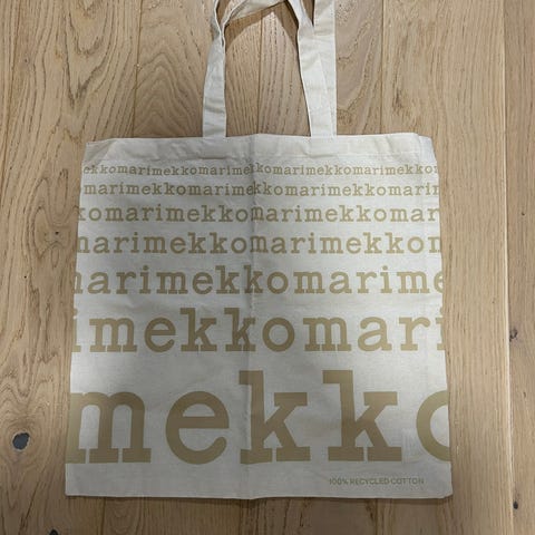 Ostan Marimekon olkalaukun vaalean beigessä sävyssä.