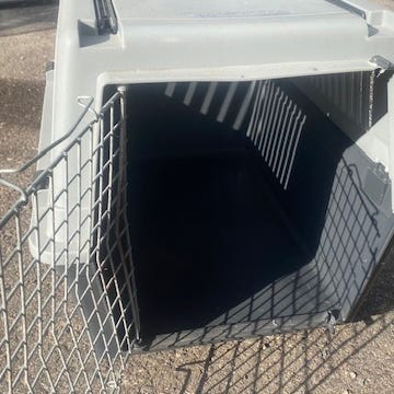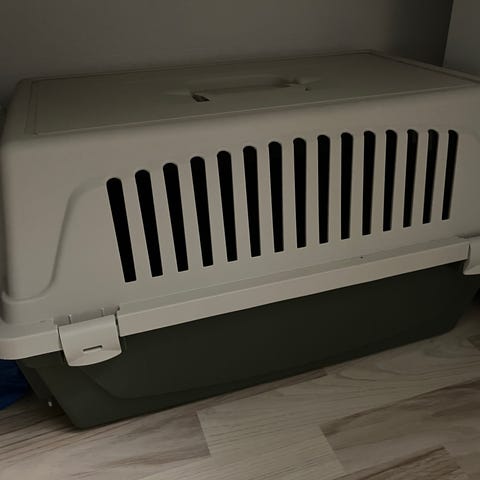 Matkalaatikko koiralle tai kissalle, valmistettu muovista. Mitat noin 44x32x30 cm. Varustettu metalliverkko-ovella ja kantokahvalla. Sisältää pehmeän alustan eläimen mukavuutta varten.