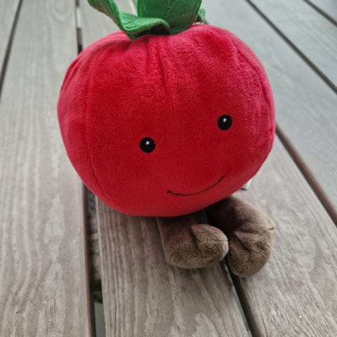 Käsintehty pehmolelu, jossa on turkismateriaali ja koristeelliset silmät. Pehmolelu on suunniteltu koristeeksi tai keräilyesineeksi.