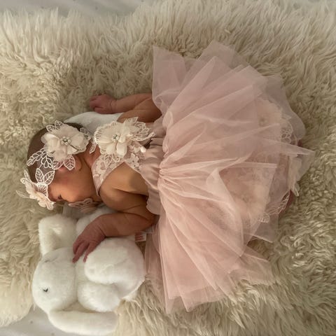 Käsintehty vauvan mekko ja hattu sekä koristeeksi pieni "käsilaukku",