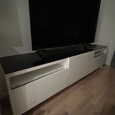 Myydään hyvässä kunnossa oleva tummanruskea Ikea Bestå tv-taso. Tv-tason päällä irtonainen valkoinen lasi, jonka voi halutessaan jättää asentamatta, mikäli tykkää tummemmasta kuosista. Lisänä kaksi lasiovea.