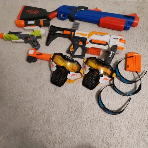 Nerf lasten leluaseet sisältäen kaksi erilaista leluasetta, musta ja oranssi väri. Mukana suojalasit ja musta suojaliivi, jotka on suunniteltu lasten käyttöön. Varusteet on valmistettu muovista ja tekstiilistä.
