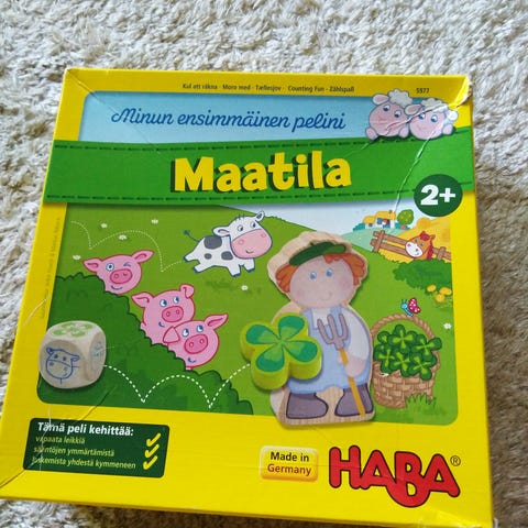 Kaikki osat tallella: neljä aidan palaa, 20 eläminen osaa, lato, maanviljelijä, pelilauta, noppa ja ohjeet.