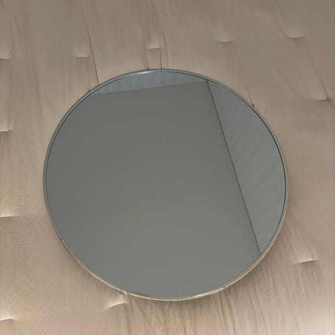 Rustasta ostettu pyöreä peili, harmaalla kehyksellä. Takana kiinnitys mahdollisuus.