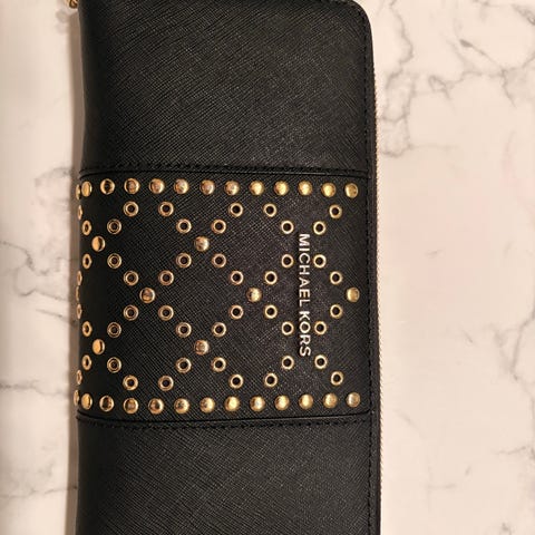 Konjakinruskea aito Michael Kors nahkainen ZIP-wallet / clutch / rannelaukku / lompakko monogram-kuvioinnilla. Hyvässä kunnossa, siisti ja ehjä sekä puhdas ja hajuton.