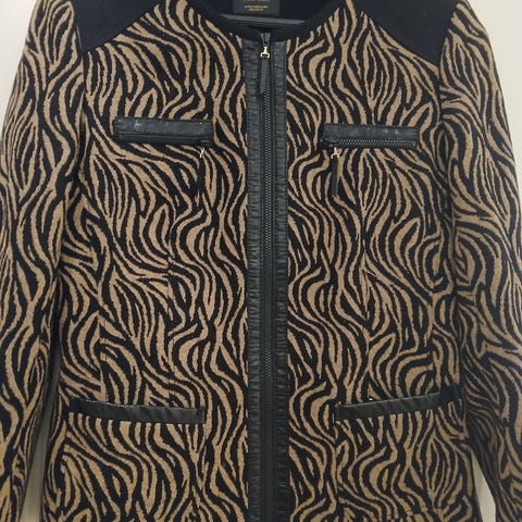 Juhlava, ohut kauniisti laskeutuva musta jakku kirjailtu kiiltävin vihrein metallilangoin, jotka välkehtivät upeasti valon mukaan. Olkatoppaukset antavat ryhtiä. Hihansuissa “timantein” koristellut napit. Sivusaumoissa helmassa halkiot. Koko 42-44. Rinnan ymp. 1/2-mitta 65 cm, koko pituus 80 cm.