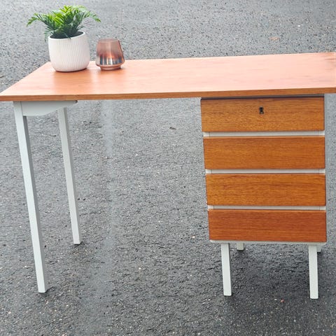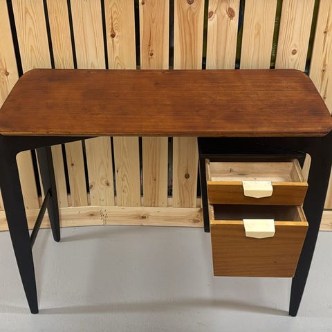Tämä työpöytä edustaa 60/70-luvun muotoilua, jossa korostuu käytännöllisyys ja selkeät linjat. Aikakaudelle tyypillinen puun ja mustan yhdistelmä luo ajattoman ilmeen, joka sopii monenlaisiin sisustuksiin. Pöydän valmistajaa ei tiedossa.Pöydässä ja tuoleissa on havaittavissa kulumaa ja naarmuja, jotka kertovat niiden pitkästä historiasta. Pöytälevyssä on pieniä jälkiä käytöstä, mutta kokonaisuus on edelleen tukeva ja käyttökelpoinen.