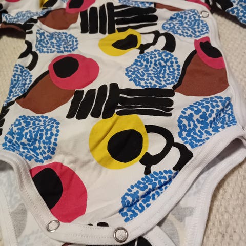 Pikkuset-merkin body englanninlakritsi kuosilla. Hihat pystyy kääntämään käsien suojaksi. Koko 56.