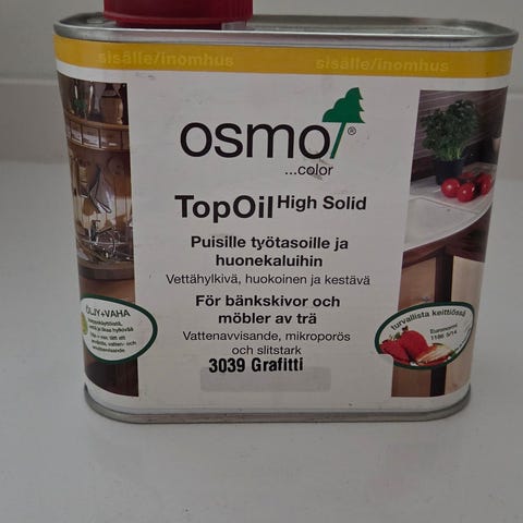 Noin reilu puolikas purkki Osmo color top oil Valkoinen 3037. Riittää hyvin 1-2 levitykseen riippuen tason koosta. Esim keittiön puisen pöytälevyn käsittelyyn, vaha ja öljy samassa. Tämä väri suositellaan, mikäli ei halua että taso tummenee käsiteltäessä.