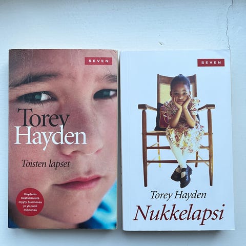 Torey Haydenin kirjoittamat pokkarit: Aavetyttö, Nukkelapsi ja Hiljaisuuden lapset. Pokkarit ovat suomenkielisiä ja sisältävät erilaisia tarinoita ja kertomuksia.