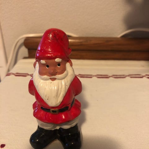 Vanha valurautainen joulupukki. Patsaan jalustassa vuosiluku 1911, 12 cm korkea, paino 770g.