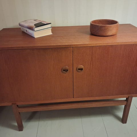 Tiikkiviiluinen täyspuinen senkki. Lakka pinnassa. Jalka osat mustat. Siisti. Kissatalous. Kirkkonummi. Käteinen.