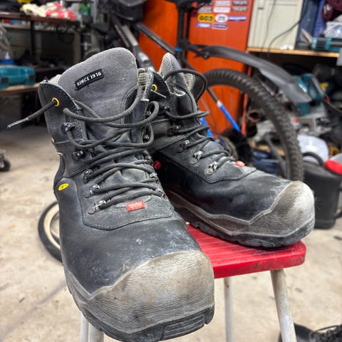 Jalas talvisaappaat, onko nämä nyt ne jatsarit. Koko 41. Oisivatkohan jopa nahkaa, varren yläosassa lukee thinsulate. Sisäpuolella pehmeä vuori. Toisen saappaan reunasta on lohjennut pala ja pohjat ovat haljenneet. Ehkä suutari korjaa? Kyllä näillä joulupukkikeikan tekee.