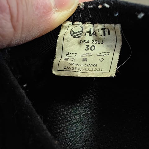 Annetaan Kuoma-kengät koko 30. Kuvassa näkyy kengän huopakankaassa olevat reiät. Voi yrittää paikata, itse en osaa, joten annetaan ilmaiseksi, jos haluaa kokeilla korjata.