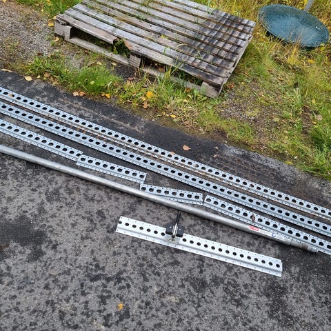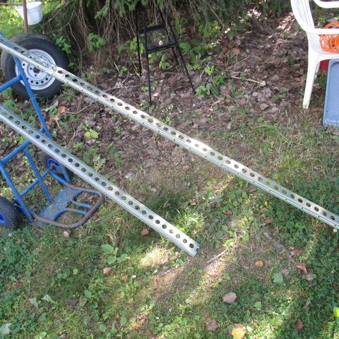 Pakettiautosta puretut kuormansidontakiskot. Joitakin käytönjälkiä. Pidempi noin 410 cm ja lyhyempi noin 320 cm.