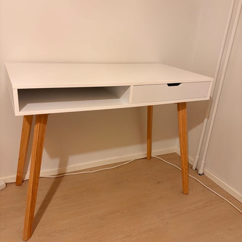 Työpöytä valmistettu vaaleanruskeasta puusta. Pöydässä on ylähylly, kaksi laatikkoa ja avoin säilytystila. Sopii erinomaisesti toimistokäyttöön tai kotitoimistoon.