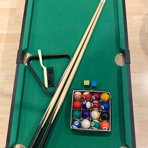 Pöytäbiljardipeli pienikokoinen, jossa vihreä pelialusta ja puiset reunat. Mukana kaksi biljardikeppiä ja värilliset biljardipallot. Soveltuu sisäkäyttöön ja viihteelliseen pelaamiseen.