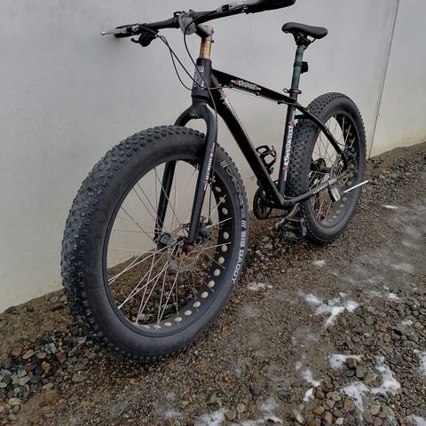Fatbike maastopyörä, jossa on musta ja vihreä runko. Pyörä soveltuu maastoajoon ja siinä on leveät renkaat, jotka parantavat pitoa erilaisissa olosuhteissa.