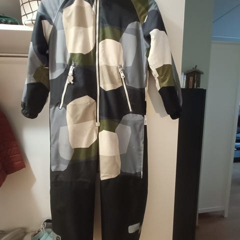 Hyväkuntoinen talvihaalari, teknisten ominaisuuksien symbolien mukaan: erittäin vedenpitävä materiaali, lämmin eristys (sopii +0:sta -20:neen asteeseen) ja hyvin hengittävä kangas.