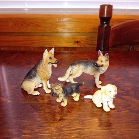 Kaksi Schleich koirafiguureja pentu ja äitikoira. Mukana juoma ja ruokakuppi.