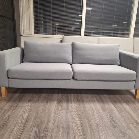 Myynnissä hyvin selkeälinjainen 2,5:n istuttava sohva. Sohvan runko ja jouset ovat ehjät. Suhteellisen sirojen käsinojien ansiosta istuin leveys on saatu maksimoitua. Istuin ja selkätyynyjen kankaat ovat irrotettavissa pesuun. Korkeat jalat mahdollistavat helpon puhtaanapidon sohvan alta. Kankaan väri vaalean ruskea / rusehtavan grayge. Huomioitavaa sohvan kunnossa: Sohvan puujaloissa imuroinnista tulleita pieniä käytönjälkiä. Sohvan hinta: 219e
