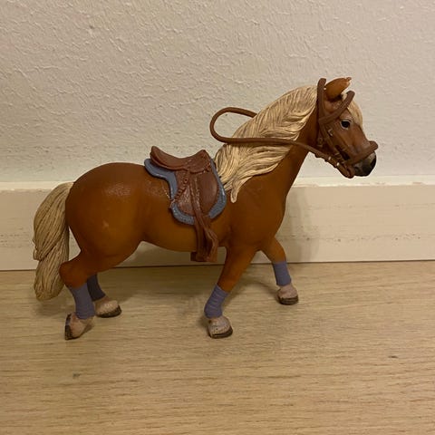 Schleich Haflinger hevonen (tamma), satula ja suitset. Uudenveroiset, näillä ei leikitty. Hevosen pakarassa oikein pieni jälki, tullut säilytyksessä ( viimeinen kuva).