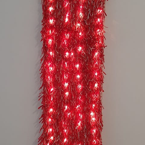 Puna.valkoinen ryijy kotiin taikka mökille. Koko 23x49 cm. Kudottu paperinarusta ja paperilangasta. Pohja puuvillakudetta, Ryijyyn voi pujottaa ledvalot.