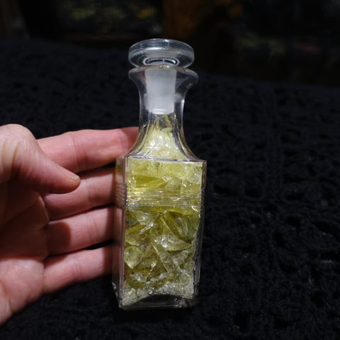 Noin 10cm korkea lääkepullo tms on täytetty uraanilasimurskalla (Riihimäen lasin valmistamaa lasia). Myydään koristekäyttöön; uraanilasi hohtaa UV-valossa komeasti. Kokonaispaino 180g. Sirpaleet suositellaan pidettäviksi pullossa, koska osa niistä on varsin teräviä. Lasista tuleva lievä säteily ei ole ihmiselle haitallista.