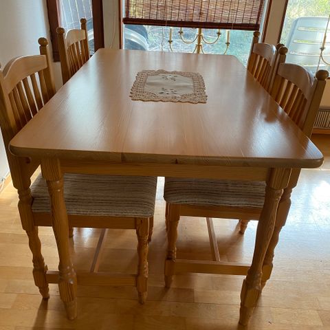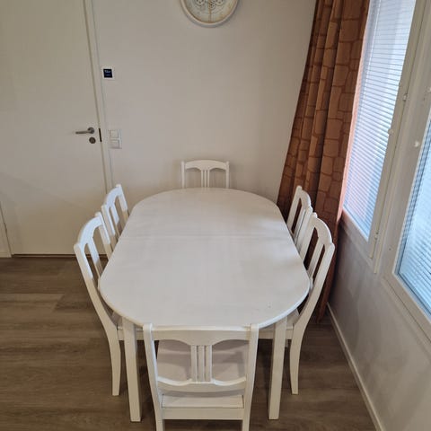 Myydään uudehko vaalea mäntypuinen ruokaryhmä neljälle. Pöytä ja kaksi penkkiä. Pöydässä ja toisessa penkissä mustat pinnijalat. Hinta koko ryhmälle 42e. Nouto Seinäjoki tai Parkano.