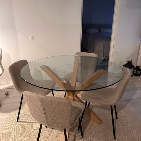 Myydään uudenveroinen ruokapöytä ja 6 tuolia. Tuoleissa muutamia tahroja, jotka lähtevät pesemällä. Pöydän halkaisija 119 cm.
