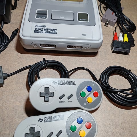 Myytävänä Super Nintendo, ohjain, kuusi peliä, av-johto ja virtalähde.