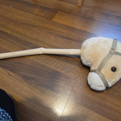 Hieno vanulla täytetty keppihevosen pää, jonka korkeus on 43 cm. Huovasta tehdyt silmät ja sieraimet. Väri harmaan beige. Myydään ilman keppiä.
