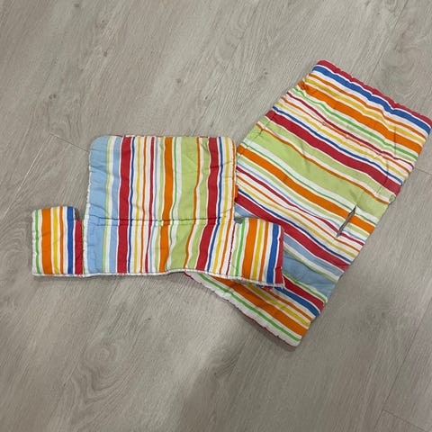 Stokke Tripp Trapp syöttötuolin pehmusteet. Pinttynyttä ruokatahraa lähinnä istuinosassa, huomioitu hinnassa.