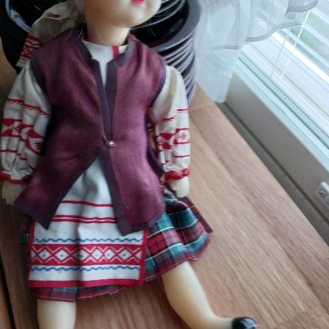 Noin 20 v. vanha nukke. Ei laula eikä tanssi enää. Pituus 36 cm.