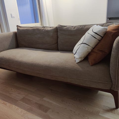 Sohva on ollut vähällä käytöllä (ostettu 2020). Yhdessä metallijalassa pieni kolhu ja istuintyynyssä pieni vaalea tahra (katso kuvat). Koirakoti. Vain nouto!
