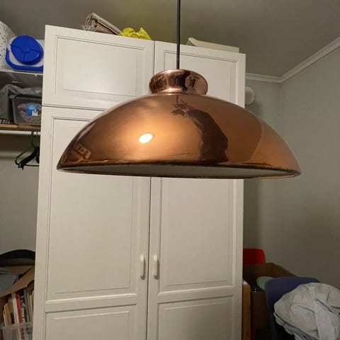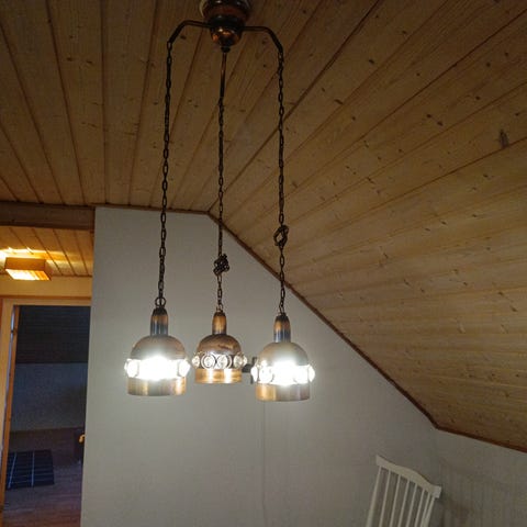 Kaunis 70-luvun kupari valaisin. Valaisin on vanha ja kuparivarjostimessa on kauniit punaiset helmet.