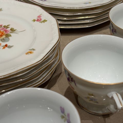 Myydään kaunis Rosenthal Sanssouci -posliinisetti, jossa on elegantti purppurakukkakuosi.