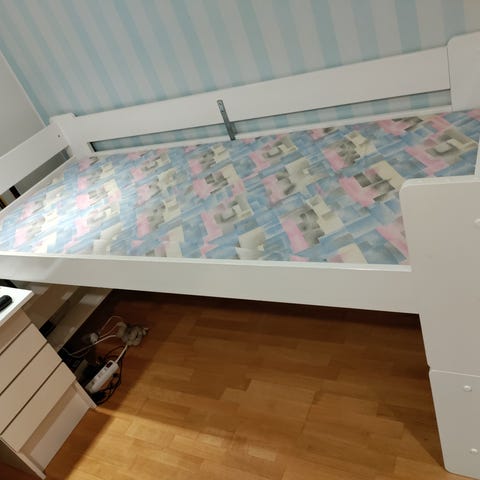 Lapsella useita vuosia käytössä ollut sänky, jossa kiva sivupöytä ja alla tilaa. Meillä ei ole haluttu enää nukkua yläsängyssä, joten sängyn alla kuvassa patjat sen vuoksi nukkumapaikkana 😁 Tikkaat ja sivukaide eivät ole kuvassa kiinni, mutta kaikki ruuvit on tallella. Voidaan purkaa sänky valmiiksi tai yhdessä ostajan kanssa!