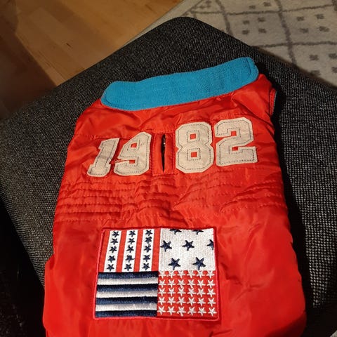 Pikkukoiran jouluasuste, ollut n 5kg kääpiöpinserillä. Ei ole pesty joten hieman likainen etenkin valkoisista kohdista.