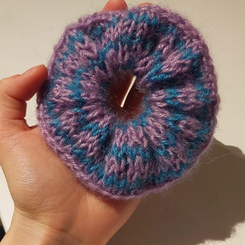Itse tehty sinine scrunchie. Halkaisija noin 13 cm.