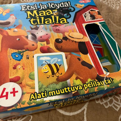 Tervetuloa maalle! Maatilalla riittää vilskettä, sillä eläimet ovat piilosilla. Kortit kertovat, mitkä kaksi eläintä pelaajien täytyy etsiä ja nopein etsijä saa palkkion. Isoista palapelipaloista koottava pelilauta on kaksipuolinen, ja pelaajat saavat tehdä siitä erilaisen vaikka jokaista peliä varten. Ole tarkkana – nämä nelijalkaiset ovat nimittäin tavallista ovelampia piiloutumaan!