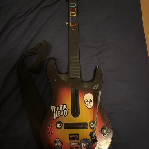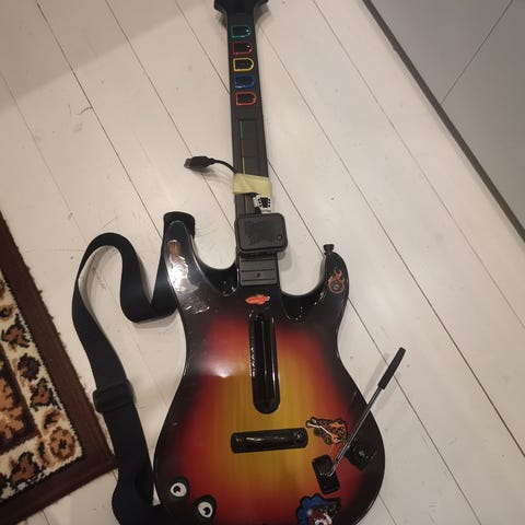 Tästä vaikkapa joululahjaksi Guitar Hero kitara. Testattu toimivaksi Clone Hero pelissä. Muuten hyvän kuntoinen, mutta kitaran kaulan lukko on jokseenkin rikki, ainoa tapa saada kaula kiinni, on painaa se sisään, laittaa lukko asentoon, ja sitten vetää kaulaa ylös, kunnes lukko tiukenee. Mukana remmi ja vastaanotin.